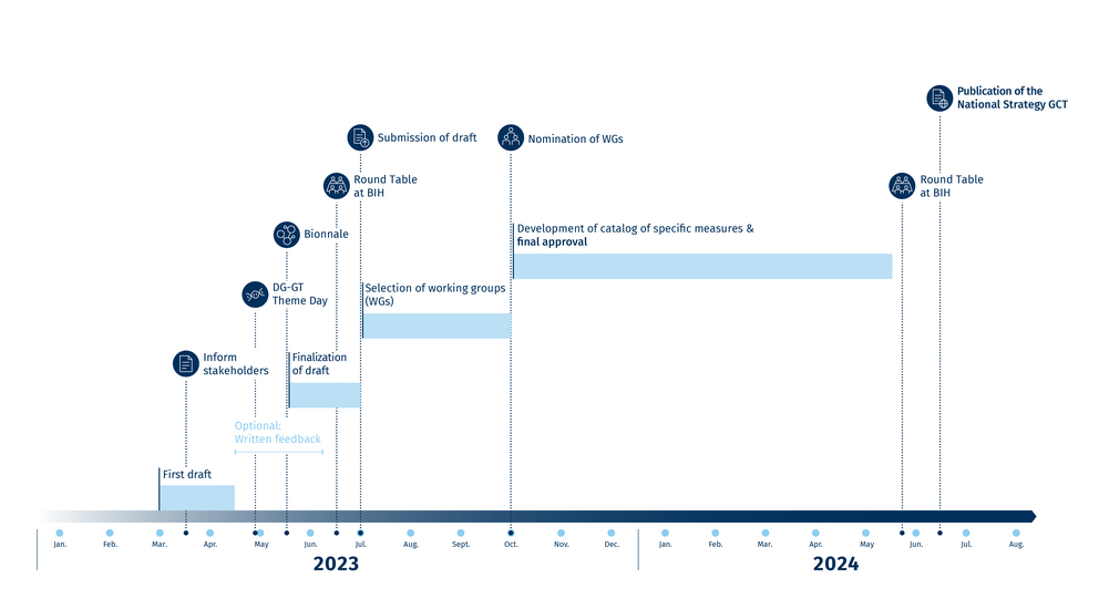 The initiative to develop a National Strategy GCT originated from the German Bundestag in November 2022, whereupon the BIH was commissioned by the former Federal Ministry of Education and Research (BMBF, which is now the BMFTR) to coordinate and moderate the National Strategy GCT in March 2023.