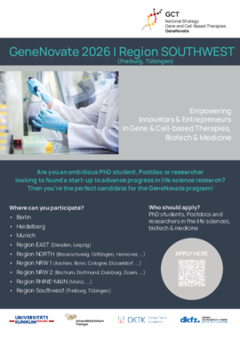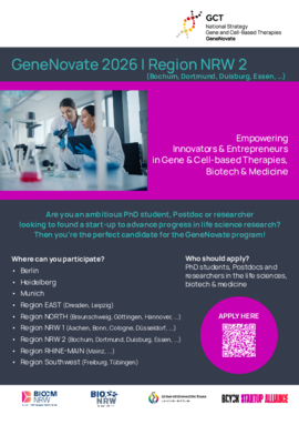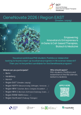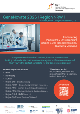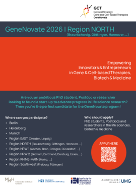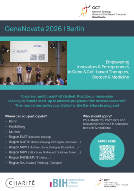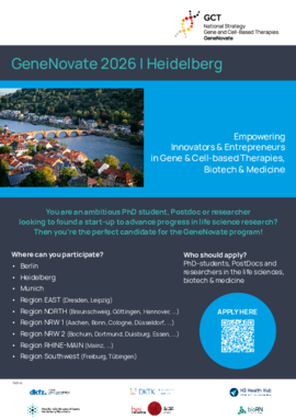 GeneNovate is the first nationwide entrepreneurship program in Germany, designed to empower innovators and entrepreneurs in the field of Gene and Cell Therapies (GCT), Biotech, Medicine Health and Life Science. The program targets early-career scientists and physicians, such as advanced students, PhD candidates, and Postdocs, but it is also open to experienced researchers and medical professionals.